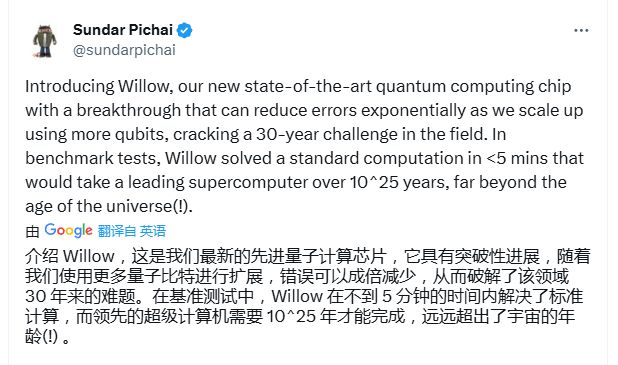 谷歌表示,其使用新一代Willow量子芯片的计算机在运行基准算法时击败了世界上最快的Frontier超级计算机,仅需几分钟完成的任务,Frontier需要10,000,000,000,000,000,000,000,000年(10亿亿亿年)才能完成——远远超过宇宙的年龄(138亿年)。这比谷歌五年前宣布的性能提升了指数级。当时,他们表示可以在几分钟内完成需要超级计算机1万年的任务。