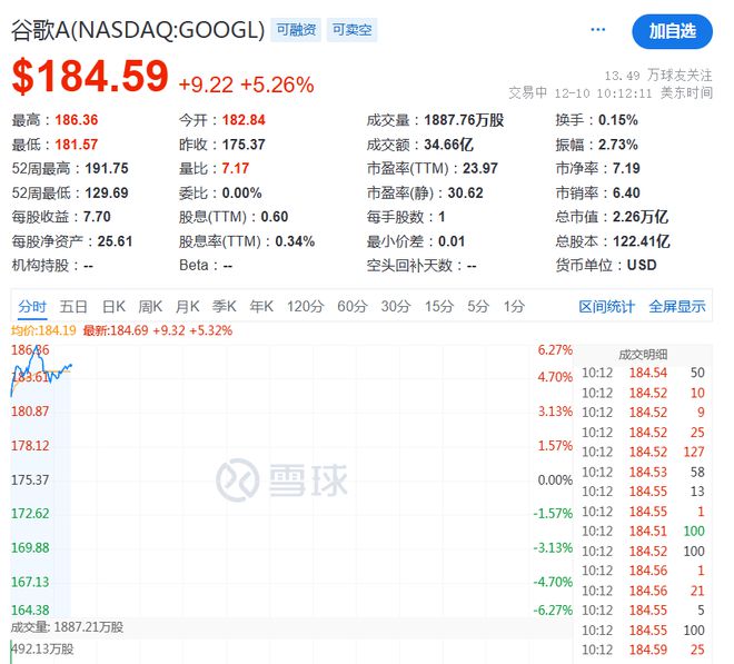 12月10日晚间,美股开盘,市场的目光聚焦在谷歌身上,其股价今晚大涨5%!