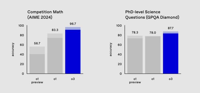 • 数学推理:o3在美国数学奥林匹克考试(AIME)中获得前所未有的 96.7%准确率,在博士级科学问题测试(GPQA Diamond)上准确率达到 87.7%,显著超过人类专家平均水平的 70%。