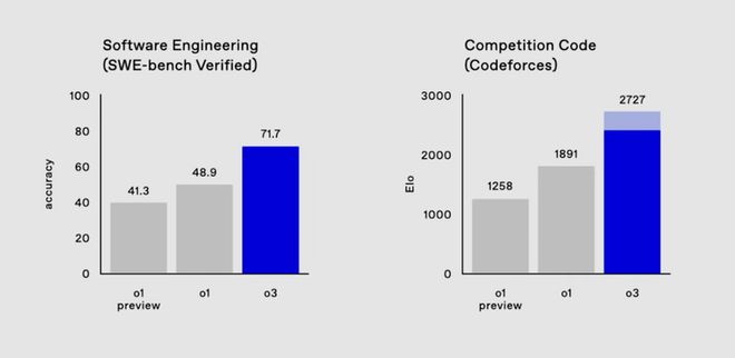 • 编程能力:在真实世界软件任务评估(HumanEval-Verified)中,o3以 71.7%的准确率刷新记录,相比前代模型o1提升 超过20%;在竞争性代码编程平台(Competition Code)上的ELO评分高达 2727,远超o1的1891。