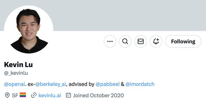 Kevin Lu毕业于加州大学伯克利分校电子信息工程与计算机科学专业,曾在Berkeley AI Research做研究工作。