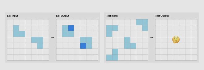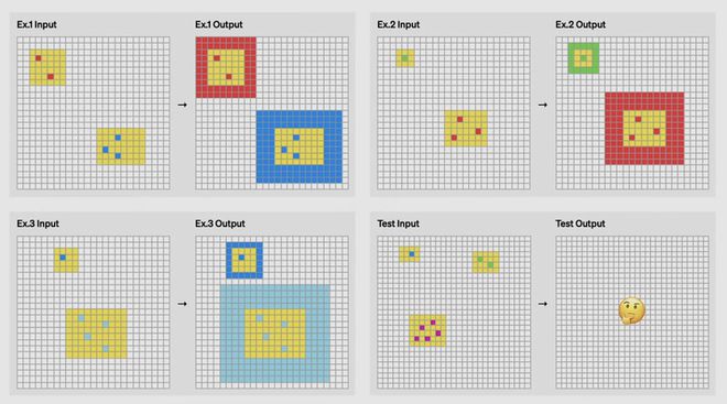 Arc AGI是由François Chollet在2019年设计的一个独特基准测试,旨在评估AI系统的通用智能水平。其特别之处在于,它不考察已学习的知识,而是要求模型通过观察几个示例, 推断新任务规则并即时学习。例如:
