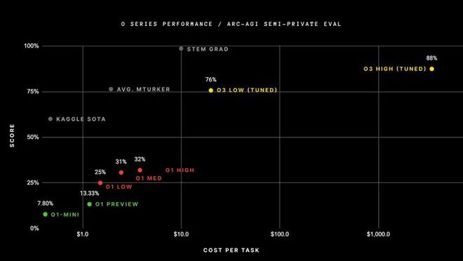 而更大的惊喜来自o3在 Arc AGI测试中的表现。