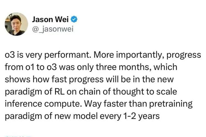 在o3发布后,OpenAI的明星研究员Jason Wei就表示,更重要的是o1到o3只用了三个月,证明了新的范式下进步可以有多快。