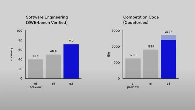 除了解决 ARC-AGI 这样的「IQ」 问题,o3 的编码能力也比之前的 o1 系列明显更胜一筹。在 SWE-bench Verified 基准上,o3 的准确率约为 71.7%,比 o1 模型高出 20% 以上。在 Competition Code 中,o3 获得了难以置信 2727 Elo 得分,而 o1 仅为 1891。