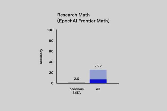 OpenAI 高级研究副总裁 Mark Chen 特别强调了,即使是专业数学家也需要几个小时甚至几天才能解决里面的问题之一。而今天,所有产品在这个基准上的准确率都低于 2%,o3 的准确率可以超过 25%。