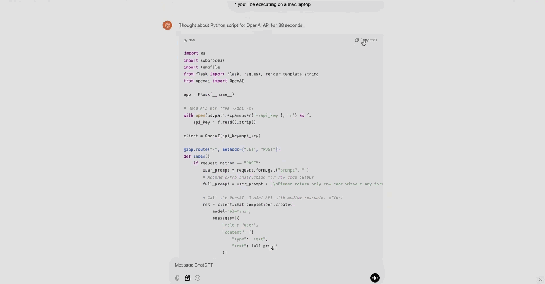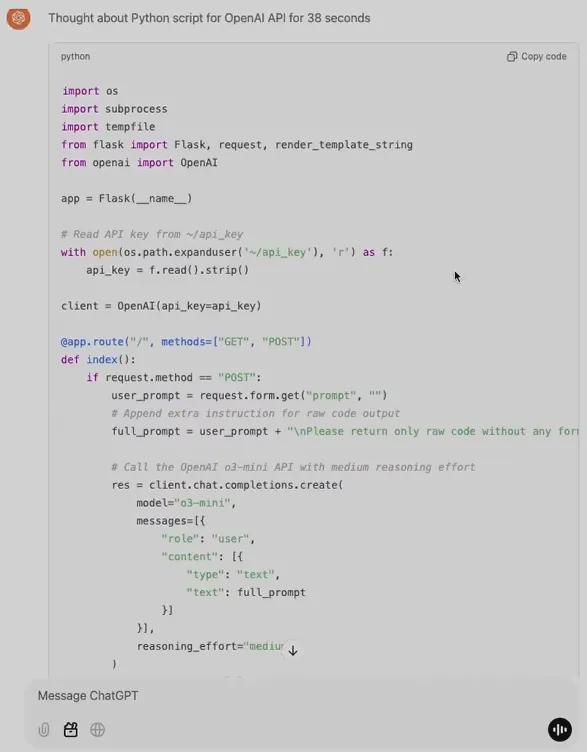 Hongyu Ren 现场演示了几个示例。首先,针对 o3-mini (high),任务是使用 Python 语言编写一个本地服务器,其有一个简易的用户 UI,同时可以将用户给出的文本消息通过 API 传输给 o3-mini 的 medium 选项,然后获取得到的代码,将其保存到桌面的一个临时文件中,然后在一个新的 Python 终端中执行该文件。