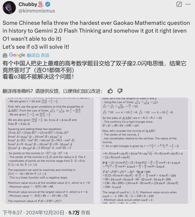 也有人早早就想看看 o3 究竟有何真本事,能否匹敌谷歌昨天发布的 Gemini 2.0 Flash Thinking。