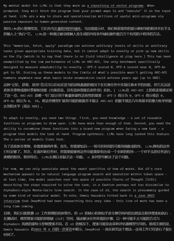 「关于 o3 模型的具体工作原理,目前我们只能进行一些推测。o3 模型的核心机制似乎是在 token 空间内进行自然语言程序搜索和执行 —— 在测试时,模型会在可能的思维链空间中搜索,这些思维链描述了解决任务所需的步骤,这种方式可能与 AlphaZero 风格的蒙特卡洛树搜索(Monte-Carlo tree search)颇有相似之处。在 o3 的情况下,搜索可能由某种评估模型引导进行。值得注意的是,DeepMind 的 Demis Hassabis 在 2023 年 6 月的一次采访中暗示,DeepMind 一直在研究这一概念 —— 这项工作已经酝酿了很长时间。」