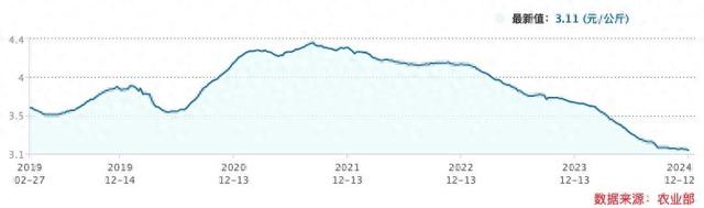 今年以来,原奶价格延续下滑趋势。农业农村部监测数据显示,12月第2周(采集日为12月12日),内蒙古、河北等10个主产省份生鲜乳平均价格3.11元/公斤,比前一周下跌0.3%,同比下跌15.3%。