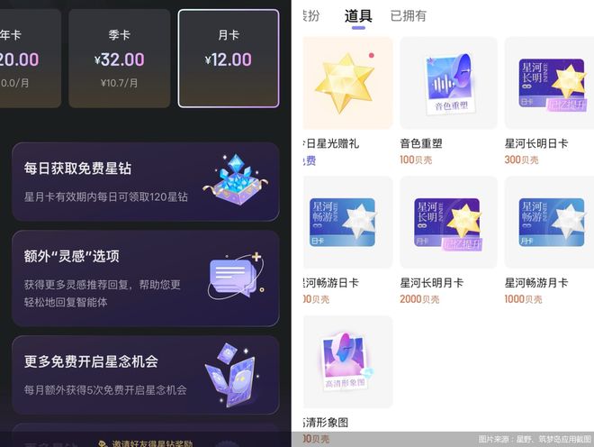 为了获得更多的聊天次数,林女士每月会花20元开通会员卡。除此之外,在星野应用中,当用户和AI伴侣聊天到一定量,就可以抽"星念卡",免费抽卡额度用完后,需要付费抽卡,抽一次需要200个星钻,即2元,有些用户"上头"之后会十连抽,花几百块抽一张AI生成的卡。