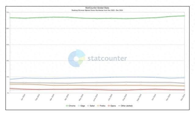 Chrome浏览器的优势地位无可争议,即便是在市场份额紧随其后的微软Edge浏览器面前,也展现出了明显的优势。Edge浏览器的市场份额虽然从12.87%上升至13.21%,但与Chrome相比,差距仍然显著。