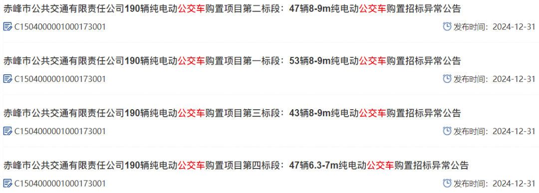 2024年12月31日,内蒙古自治区公共资源交易网发布四则公交车招标异常公告。公告显示,赤峰市公共交通有限责任公司190辆纯电动公交车购置项目四个标段,每个标段依据《中华人民共和国招标投标法实施条例》及招标文件要求,有效投标家数不足三家,将重新招标。