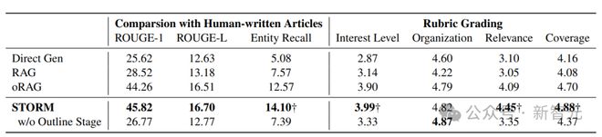 从上表可以发现,利用STORM生成的文章完全不输于人类水平,并且也优于目前LLM生成文章的几种范式,如效果最强的oRAG。