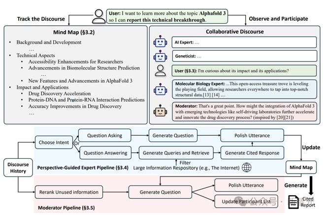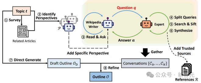 接着,它会模拟这样一场对话:一方是维基百科撰写者,其会依据给定视角提出问题,另一方则是基于可靠网络来源的专家(步骤3-6)。