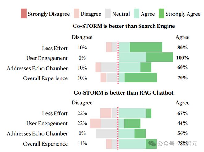 为了更真实地反映用户体验,研究者对20名志愿者进行了人类评估,比较了Co-STORM与传统搜索引擎和RAG Chatbot的表现。结果显示: