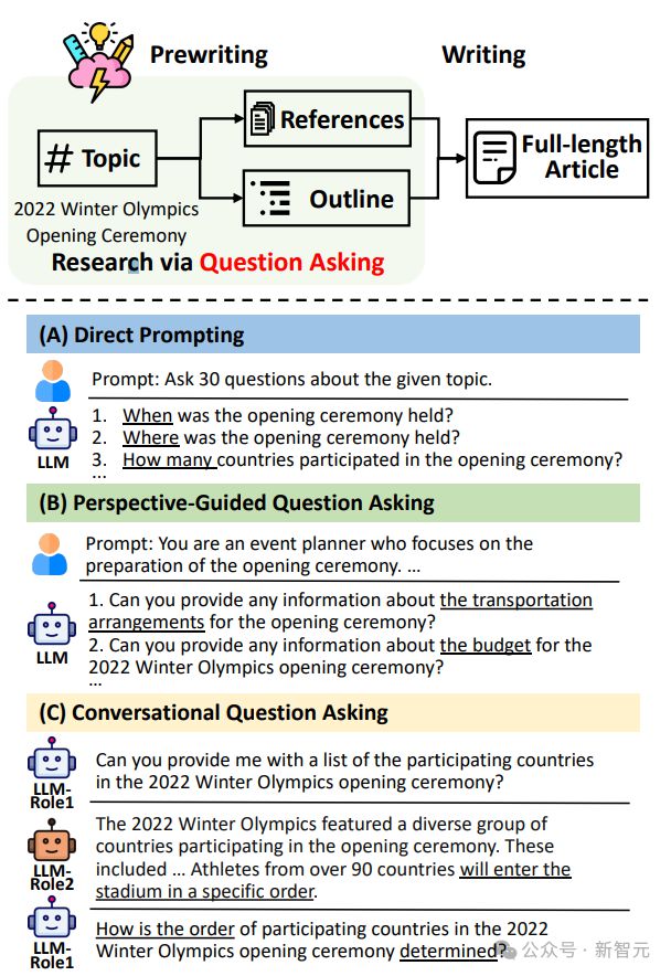 根据LLM的固有知识, 从不同视角收集到的对话内容, 最终精心编排了写作大纲(步骤7-8)。