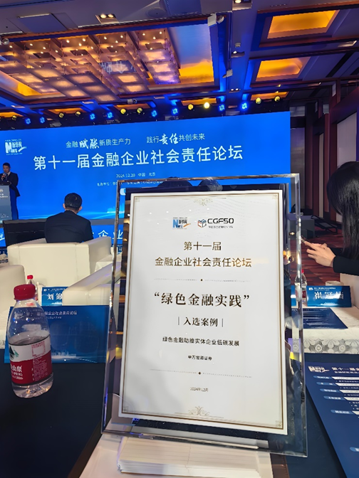 本报讯 12月20日,由新华网主办、中国绿色金融50人论坛提供学术支持的第十一届金融企业社会责任论坛在北京举行,论坛以“金融赋能新质生产力 践行责任共创未来”为主题,围绕科技金融、绿色金融、普惠金融、养老金融、数字金融五个方面发布了“2024金融企业社会责任实践案例”,申万宏源证券获评“绿色金融实践”入选案例。