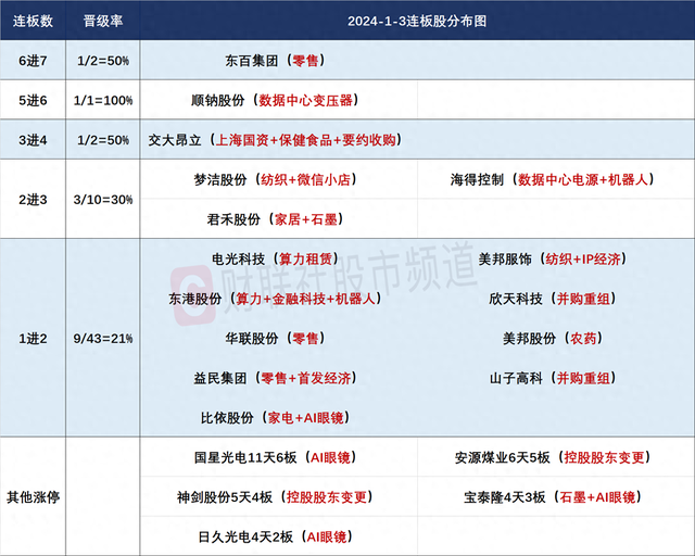 【1月3日连板股分析:连板股晋级率40% AI眼镜概念盘中活跃】今日共47股涨停,连板股总数15只,其中三连板及以上个股6只,上一交易日共15只连板股,连板股晋级率40%(不含ST股、退市股)。个股方面,全市场超4700只个股下跌,逾百股跌停或跌超9%,连续3个交易日超4000只个股下跌。小盘股再度领跌,微盘股指数跌超5%。高位股普遍分歧,中百集团、来伊份跌停,即便是成功晋级的东百集团、顺钠股份等也在盘中多次炸板。板块方面,AI眼镜概念盘中保持活跃,国星光电11天6板、宝泰隆4天3板、比依股份5天3板,消息面上,美国专利及商标局官网显示,英伟达公开了一项AR眼镜专利,名为“无背光增强现实数字全息技术”;防御属性的医药板块多股涨停,鲁抗医药、新华制药、罗欣药业(维权)等抗流感药物股涨停,近一个月内,呼吸道疾病用药销量持续走高。