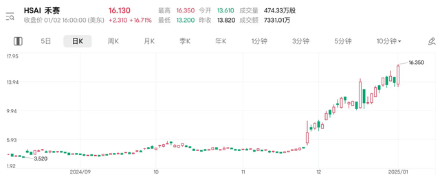 值得一提的是,与速腾聚创一同被称为国内激光雷达双雄的禾赛科技(HSAI)近期在美股市场上的走势也堪称一骑绝尘。截至1月2日收盘,禾赛科技美股股价自2024年11月的前期低点已经累计上涨了近300%。