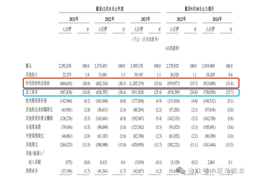 招股书数据显示,2021 -2023 年,其原材料及耗材支出金额分别为 8.46 亿元、8.62亿元和 12.05 亿元,占各年度营业收入的比例依次为36.9%、36.3% 和 33.6%,呈逐步下降趋势;2024 年前 9 个月,该项支出达9.15 亿元,占比降至 31.4%,这在一定程度上反映了餐厅在成本优化方面所做的努力和取得的成效。这一成果可能得益于其与 190 家第三方食材加工公司的合作,通过将食材大部分制备流程交由这些公司高度标准化的设施完成,以绿茶烤鸡等招牌菜为例,采用第三方提供的预处理食材和烘焙产品进行后续加工,实现了原材料成本控制和生产效率提升。