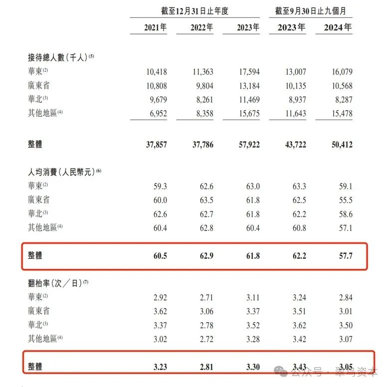 2021 - 2023 年,客单价分别为 60.5 元、62.9 元、61.8 元,翻台率分别为 3.23 次 / 日、2.81 次 / 日、3.3 次 / 日;而 2024 年前三季度,人均消费降至 57.7 元,翻台率从 2023 年的 3.3 次下降至3.05 次。