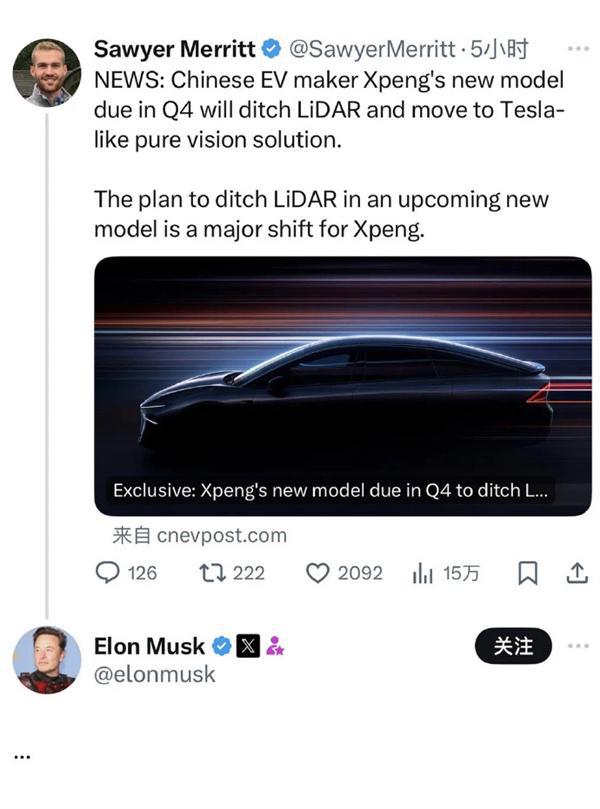 当时多数人认为马斯克的反应是指何小鹏在美国体验过FSD后,新车P7+弃用激光雷达。