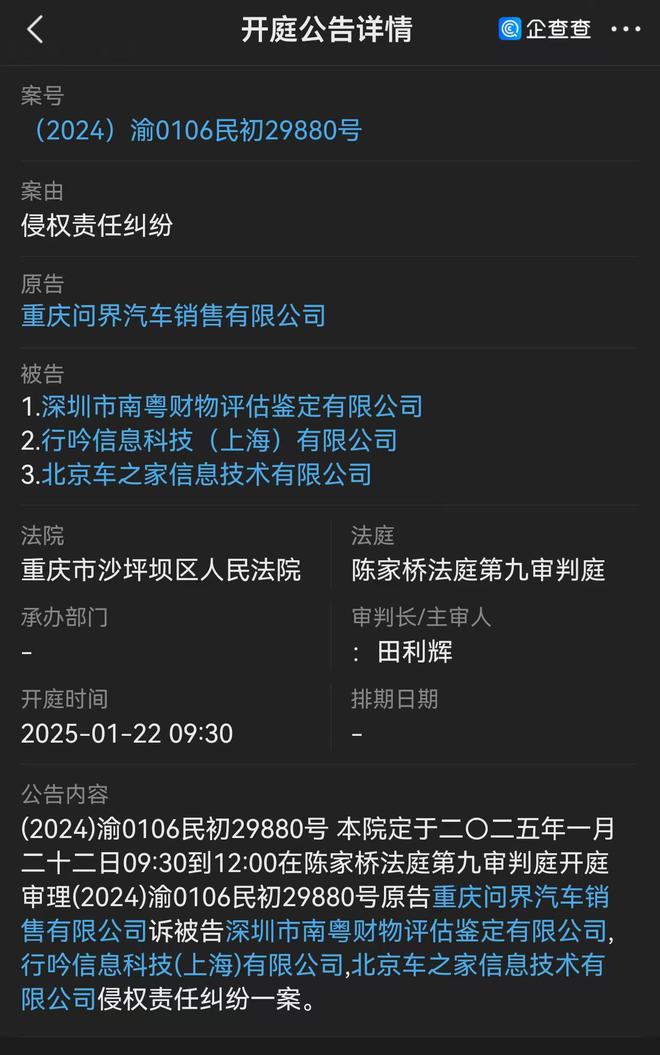 三言科技1月3日消息,据企查查App显示,重庆问界汽车销售有限公司新增一条诉讼开庭公告信息。该信息显示,问界汽车将深圳市南粤财物评估鉴定有限公司、行吟信息科技(上海)有限公司和北京车之家信息技术有限公司,以“侵权责任纠纷”案由,起诉至重庆市沙坪坝区人民法院,案件将于1月22日开庭审理。