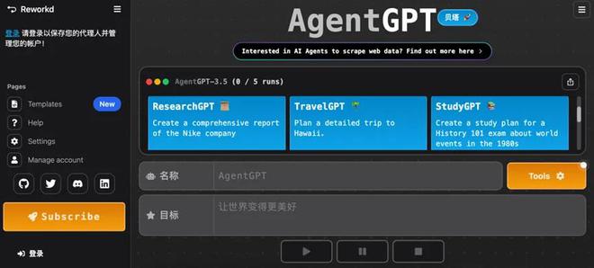 AgentGPT是一个在浏览器运行的Agent,用户可直接在线创建、配置并部署自主AI Agent,操作简单,无需编码技能。