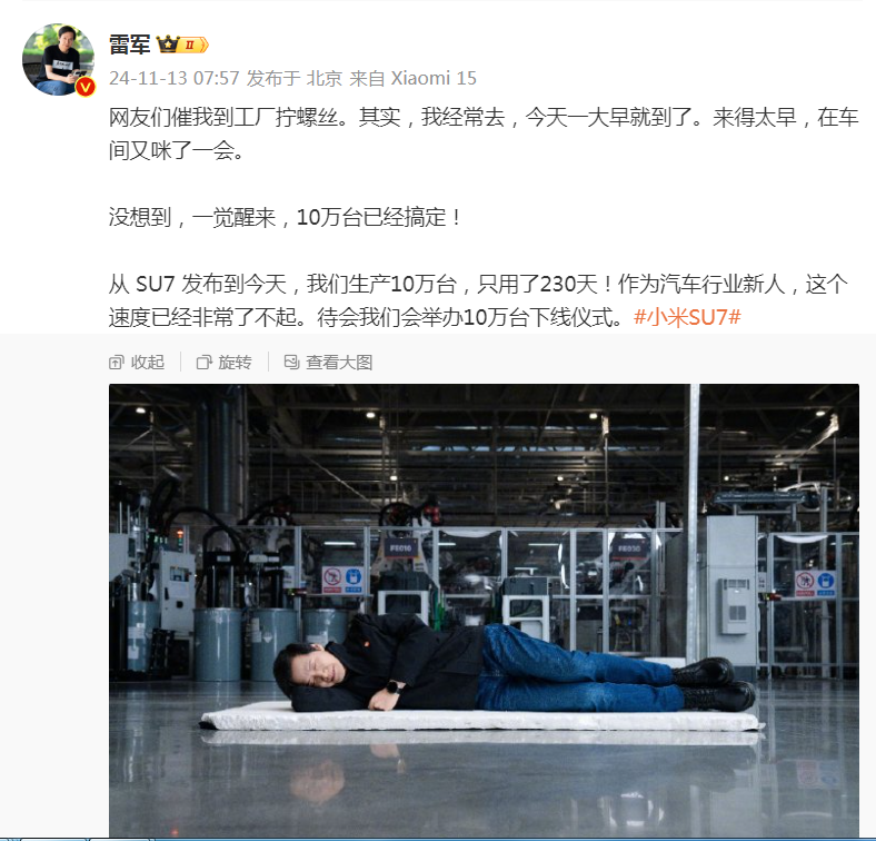 雷军曾多次出镜小米汽车工厂。11月13日,雷军在个人社交账号发了一张躺在车间地板上睡觉的照片,并表示,“网友们催我到工厂拧螺丝。其实,我经常去,今天一大早就到了。来得太早,在车间又眯了一会。”