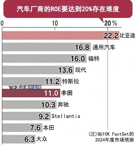QUICK FactSet对2024年车企ROE的预测数据 日经中文网