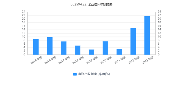 比亚迪2015-2023年的ROE表现 同花顺