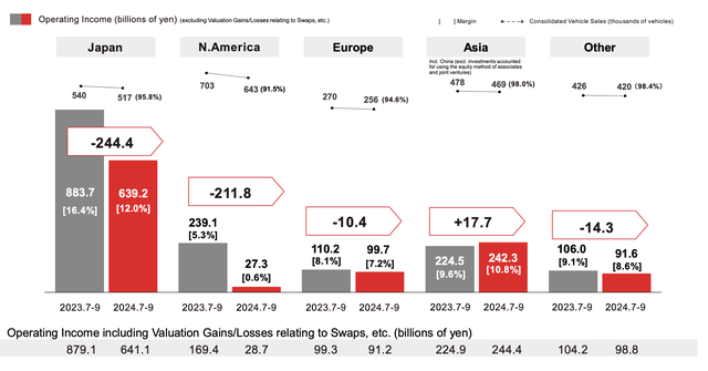 事实上就财报数据来看,2024上半财年丰田除日本外的亚洲市场销量为46.9万辆,同比下滑2.0%,营业利润为2423亿日元(约合人民币112.7亿元),营业利润率为10.8%。其中销量降幅是所有市场中最低的,营业利润和利润率也均仅次于日本本土市场。