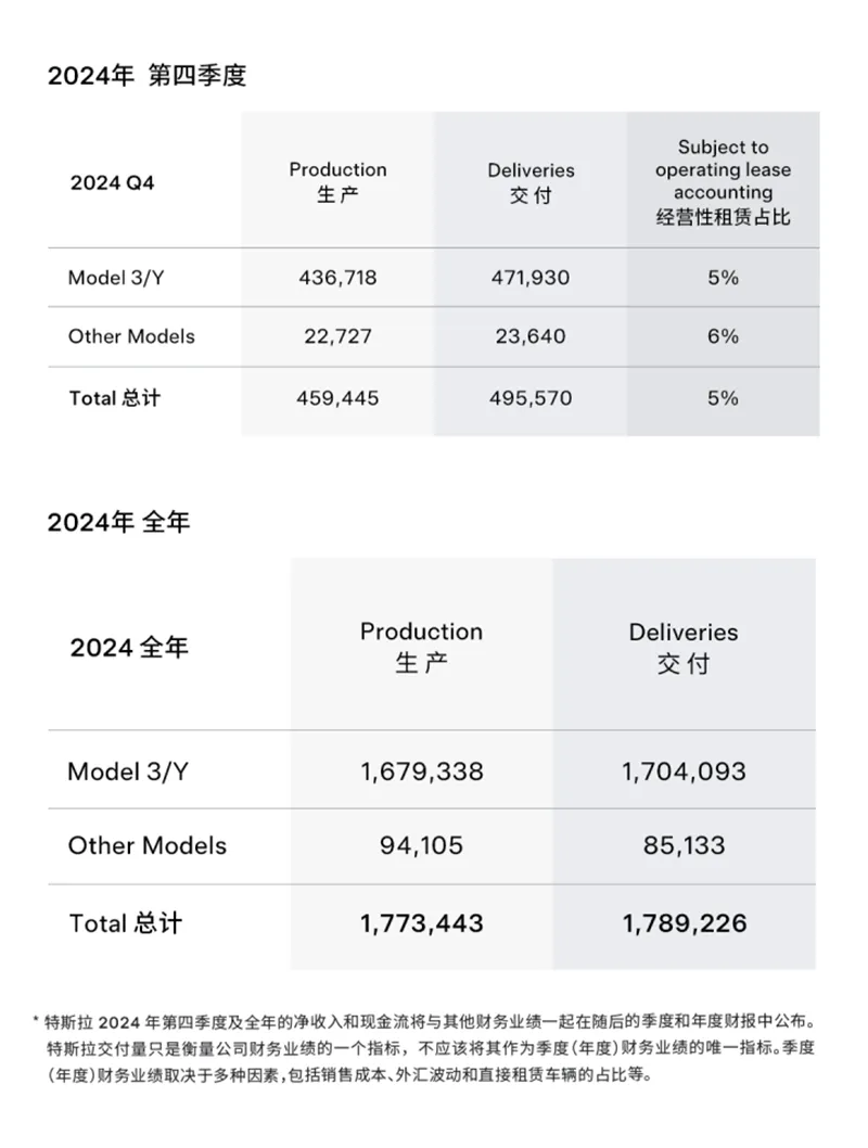 特斯拉最新发布的2024年全球生产与交付报告显示,2024年全年,特斯拉在全球范围内共计生产电动车约177.3万辆,交付约178.9万辆;储能产品全年装机量达31.4吉瓦时。