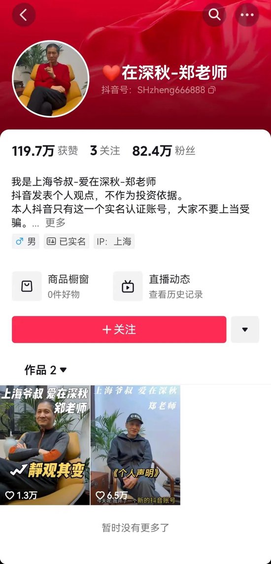 1月5日,网友发现,上海爷叔“爱在深秋-郑老师”的抖音账号已经删除了全部股市点评视频,目前仅保留了两条无关紧要的视频。