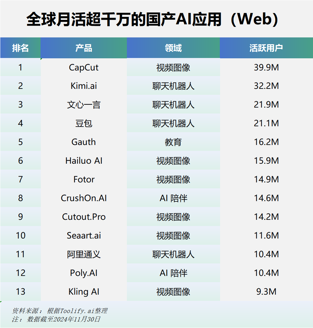 同时,Toolify.ai数据显示,2024年11月共有12款中国网页端AI产品跻身“千万月访问量俱乐部”,且产品涵盖了多个细分领域。其中,聊天机器人应用包括Kimi.ai、文心一言、豆包和阿里通义,视频图像类应用包括CapCut、Hailuo AI、Fotor、Cutout.Pro和SeaArt.AI。