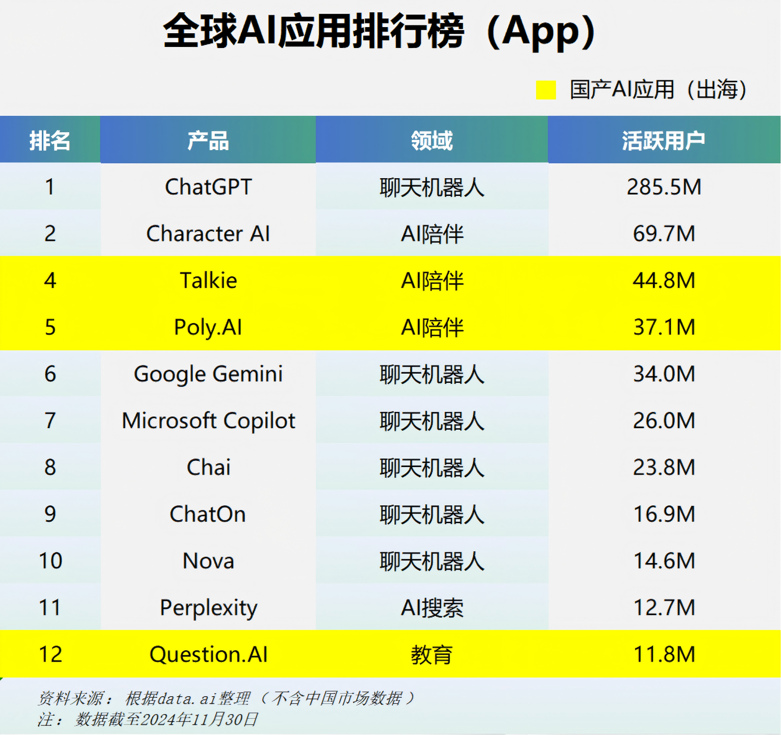 据data.ai最新统计数据(App),2024年11月共有三款中国企业在海外推出的AI应用月度活跃用户数(MAU)超千万,分别是Talkie、Poly.Ai、Question.AI。