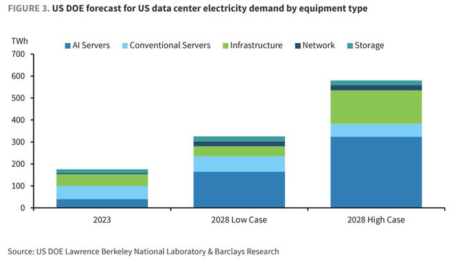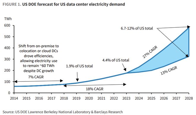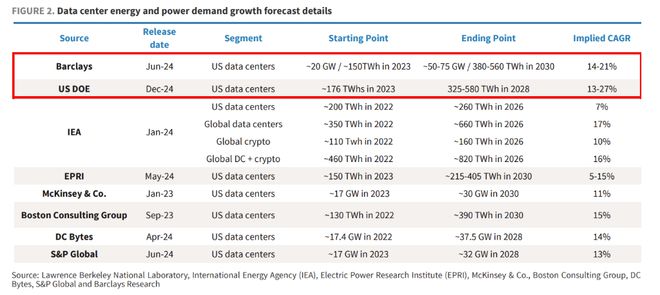 1月3日,巴克莱分析师William Thompson及其团队发布报告,分析、总结了美国能源部(DOE)发布的约70页国会授权研究报告预测。美国能源部预测,从2023年开始,美国数据中心的电力需求(不包括加密货币)将每年增加约13-27%,到2028年时将达到325-580TWh(1太瓦时 = 10亿千瓦时),占美国总电力需求的6.7%-12%。按照这一预测,从2023到2028年,美国数据中心的电力需求有望增长2-3倍。