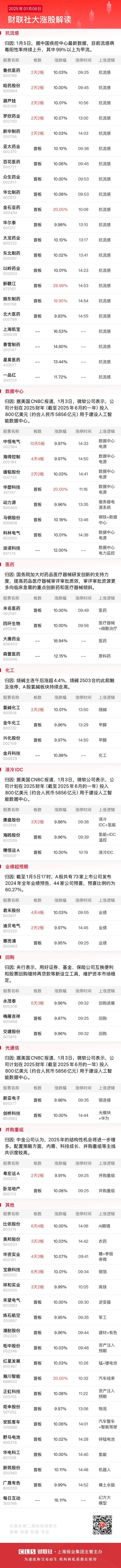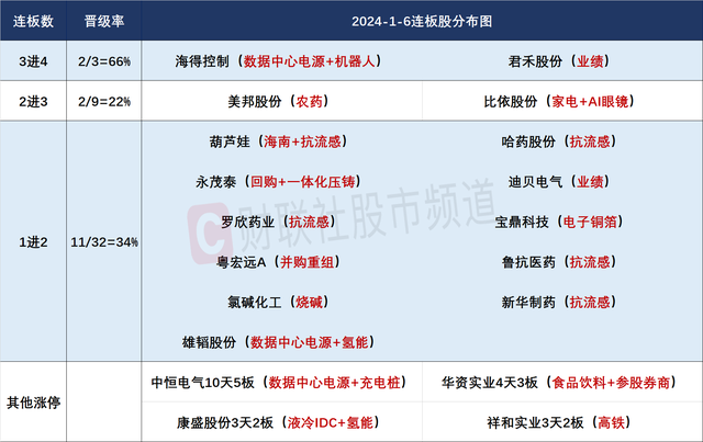 财联社1月6日讯,今日59股涨停,21股炸板,封板率为74%,海得控制、君禾股份4连板,美邦股份3连板,北交所新赣江30CM首板,比依股份6天4板,中恒电气10天5板,华资实业4天3板,宝鼎科技、永茂泰6天3板。市场全天弱势震荡,三大指数均小幅下跌,沪指盘中一度跌破3200点。沪深两市全天成交额1.06万亿,较上个交易日缩量2092亿,成交金额创去年9月25日以来新低。盘面上,热点较为杂乱,个股跌多涨少,全市场逾百股跌停或跌超9%。板块方面,流感、中药、医药商业、其他电源设备等板块涨幅居前,零售、AI眼镜、白酒、食品等板块跌幅居前。截至收盘,沪指跌0.14%,深成指跌0.12%,创业板指跌0.09%。