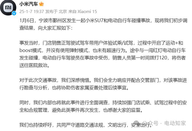 电动知家消息,2025年1月7日,小米汽车公布1月6日小米SU7事故初步调查结果。小米汽车表示,1月6日,宁波市鄞州区发生一起小米SU7和电动自行车碰撞事故,现将我们初步调查结果,向大家汇报如下: