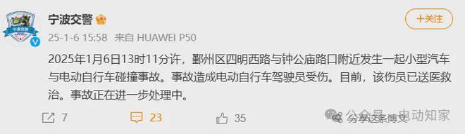 1月6日下午,宁波交警也发布通报,2025年1月6日13时11分许,鄞州区四明西路与钟公庙路口附近发生一起小型汽车与电动自行车碰撞事故。事故造成电动自行车驾驶员受伤。目前,该伤员已送医救治。事故正在进一步处理中。