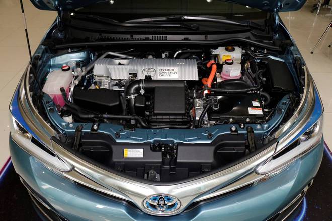 这辆通体蓝色的卡罗拉用的是一台 1.8L 发动机,动力水平只有 99 马力和 142 牛米,匹配一套可输出 136 马力和 207 牛米的电机,10.5kWh 的电池组可以提供 55 公里的纯电续航。