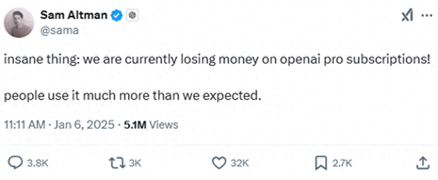 周一,OpenAI首席执行官奥尔特曼在X上发帖称,该公司的ChatGPT Pro订阅服务目前正在亏损,人们使用它的次数比公司预期的要高很多。他还在另一条回复中指出,他亲自制定了订阅价格,原以为OpenAI会通过此收费赚到钱。