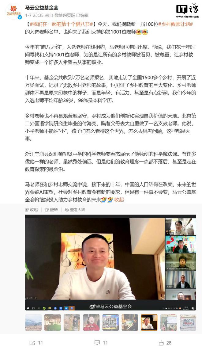 IT之家 1 月 9 日消息,据马云公益基金会 1 月 7 日晚消息,新一届 100 位马云公益基金会乡村教师计划的入选老师名单揭晓,马云基金会迎来了第 1001 位乡村教师。马云也如约而至,与 1001 位乡村教师一起在线参加了今年新入选教师的揭晓典礼,一起度过了这个“腊八之约”。