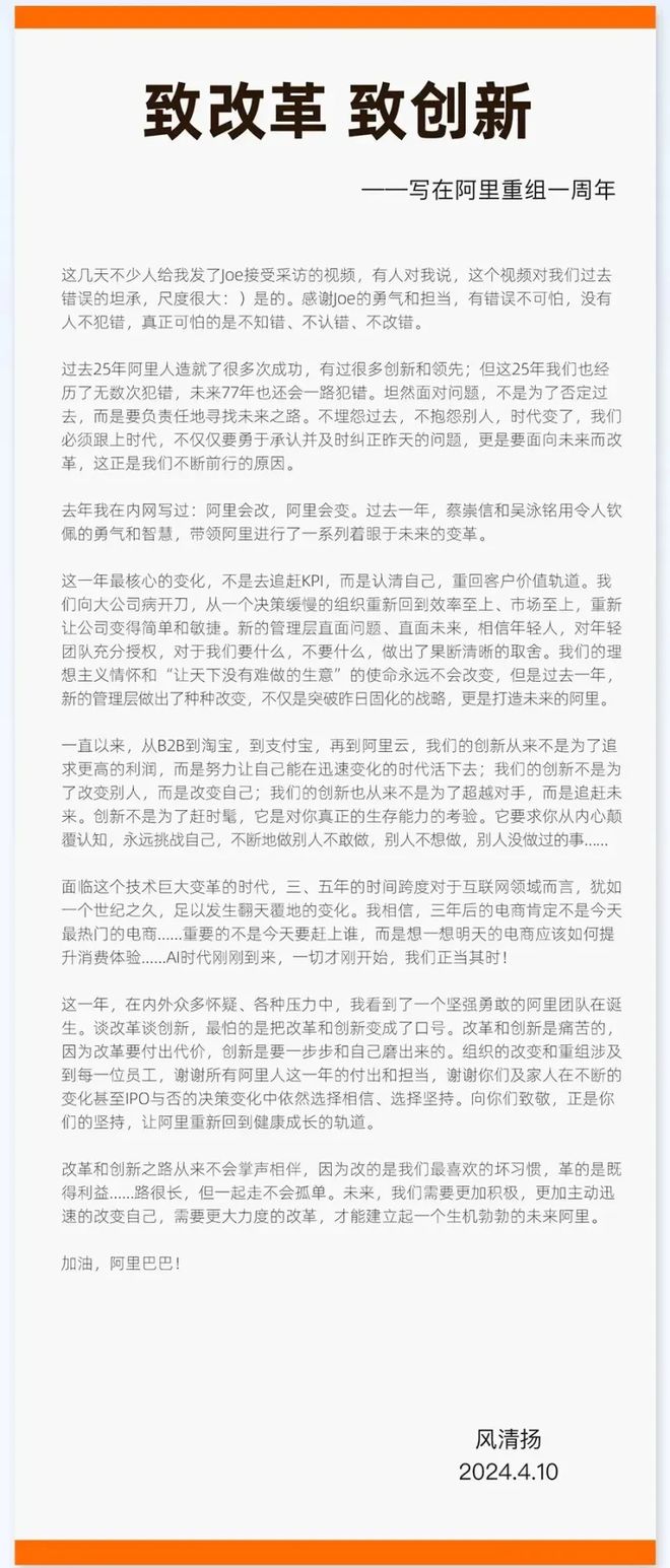 据IT之家此前报道,2024 年 4 月,马云在阿里内网发表题为《致改革 致创新》的帖子,高度肯定蔡崇信和吴泳铭组成的新管理层的变革勇气,称阿里巴巴已重回健康成长轨道,并支持继续改革。