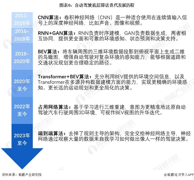 自动驾驶算法模块可分为感知、决策和规划控制三个环节,其中感知模块为关键的组成部分,经历了多样化的模型迭代:CNN(2011-2016年)——RNN+GAN(2016-2018年)——BEV(2018-2020年)——Transformer+BEV(2020年至今)——占用网络(2022年至今)——端到端(2023年至今)。