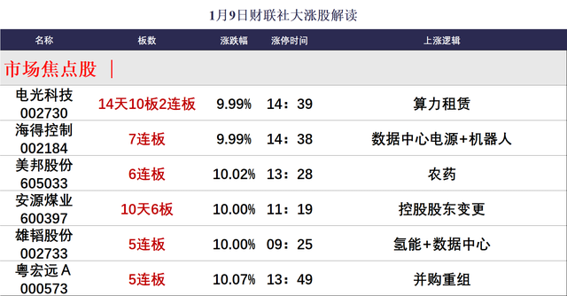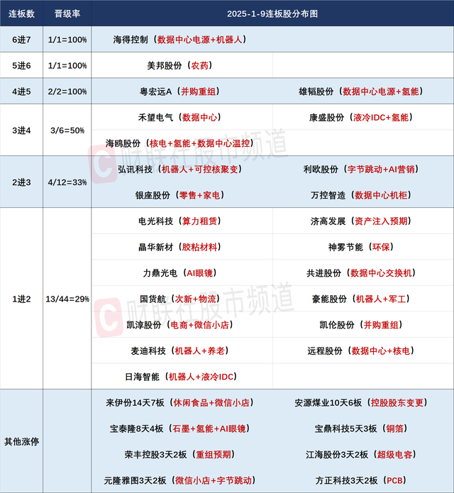 财联社1月9日讯,今日87股涨停,19股炸板,封板率为82%,海得控制7连板,美邦股份6连板,粤宏远A、雄韬股份5连板,康盛股份6天5板,禾望电气、海鸥股份4连板,弘讯科技、万控智造、银座股份、利欧股份3连板,电光科技14天10板,安源煤业10天6板,宝鼎科技9天4板,日海智能5天3板,共进股份6天3板,北交所则成电子30CM涨停。沪深两市全天成交额1.11万亿,较上个交易日缩量1310亿。盘面上,题材股相对活跃,个股涨多跌少,全市场超2700只个股上涨,逾百股涨停或涨超10%。板块方面,PCB概念、人形机器人、液冷服务器、军工等板块涨幅居前,港口、油气、流感、服装等板块跌幅居前。截至收盘,沪指跌0.58%,深成指涨0.32%,创业板指涨0.11%。
