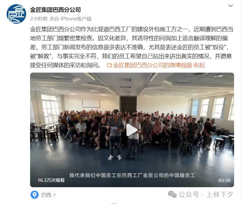外交部发言人郭嘉昆1月8日主持例行记者会。路透社记者提问,一位劳动监察员星期二(1月7日)透露,比亚迪施工方通过不合规签证将数百名中国工人带到巴西建厂,该监察员称,比亚迪已承诺遵守当地劳动法,为仍留在该国的工人提供保障。外交部是否掌握有关此事的最新情况?郭嘉昆表示,“正如我们多次强调的,中国政府高度重视保障劳动者合法权益,一贯要求中资企业依法依规经营。中方愿继续同巴方一道,本着平等互利、合作共赢的原则,持续加强各领域的交流合作。”资料:巴西方面披露相关细节:西方面披露的部分细节:巴西劳工部在调查过程中发现,比亚迪及其承包商金匠集团存在违规用工情形,包括使用不合规的签证将数百名中国工人带至巴西参与工厂建设。恶劣的工作环境:据报道,工人居住条件恶劣,例如睡在没有床垫的床上,31人共用一个浴室,且为了确保准时上班,工人们不得不早早起床。此外,还提到了工人工作环境的安全问题。护照控制:巴西劳工部指出,工人的护照被公司控制,这可能导致工人的人身自由受限。