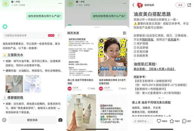 但当我们询问点点“油性皮肤怎么买美白产品”后,点点只能给到非常片面的数个产品推荐及理由,反而没有答案来源中的一篇用户帖子全面,起码帖子里有清晰的美白思路、产品搭配、使用方法的详细科普。