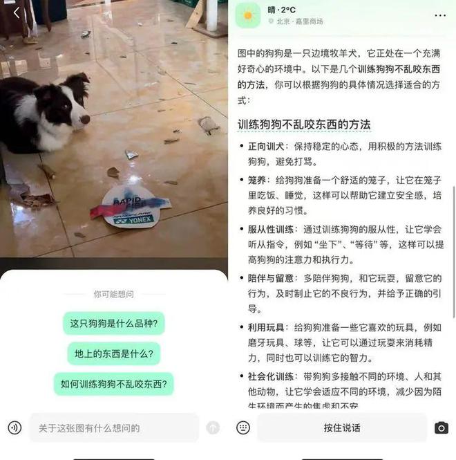 对此,点点理解到这只狗可能造成了破坏,并主动引导用户探讨如何避免宠物乱咬东西行为。这种"看图说话"的能力,让搜索过程更接近自然对话。
